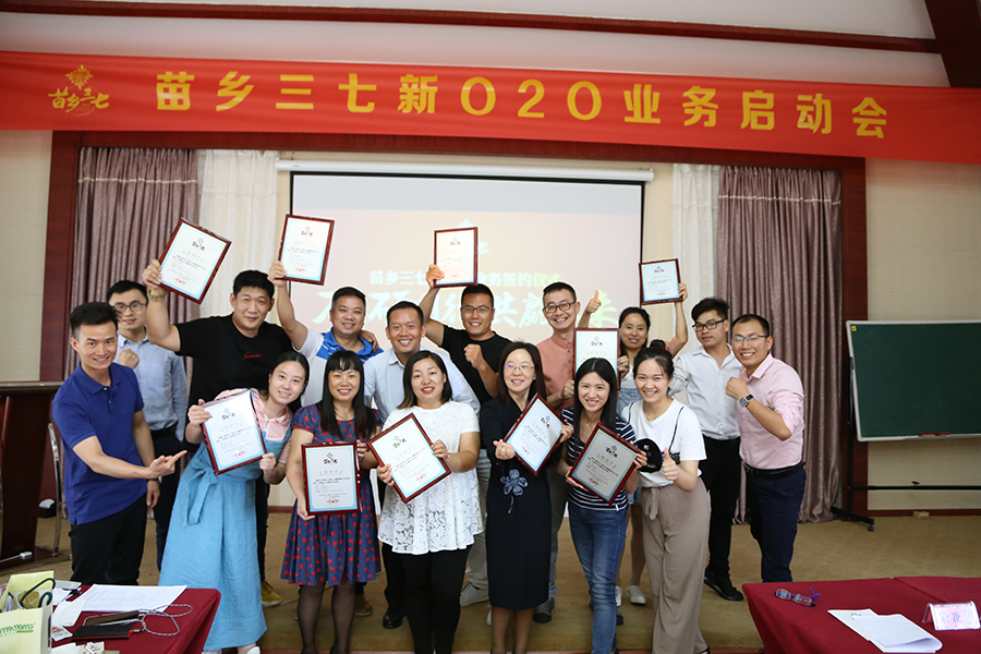 ? ? ? 2018年8月11日,苗鄉(xiāng)三七新O2O業(yè)務(wù)啟動會在苗鄉(xiāng)科技園正式開幕,十位來自全國各地的業(yè)務(wù)代表受邀參加,與苗鄉(xiāng)公司伙伴共同見證O2O經(jīng)歷優(yōu)化調(diào)整后的全新開始。