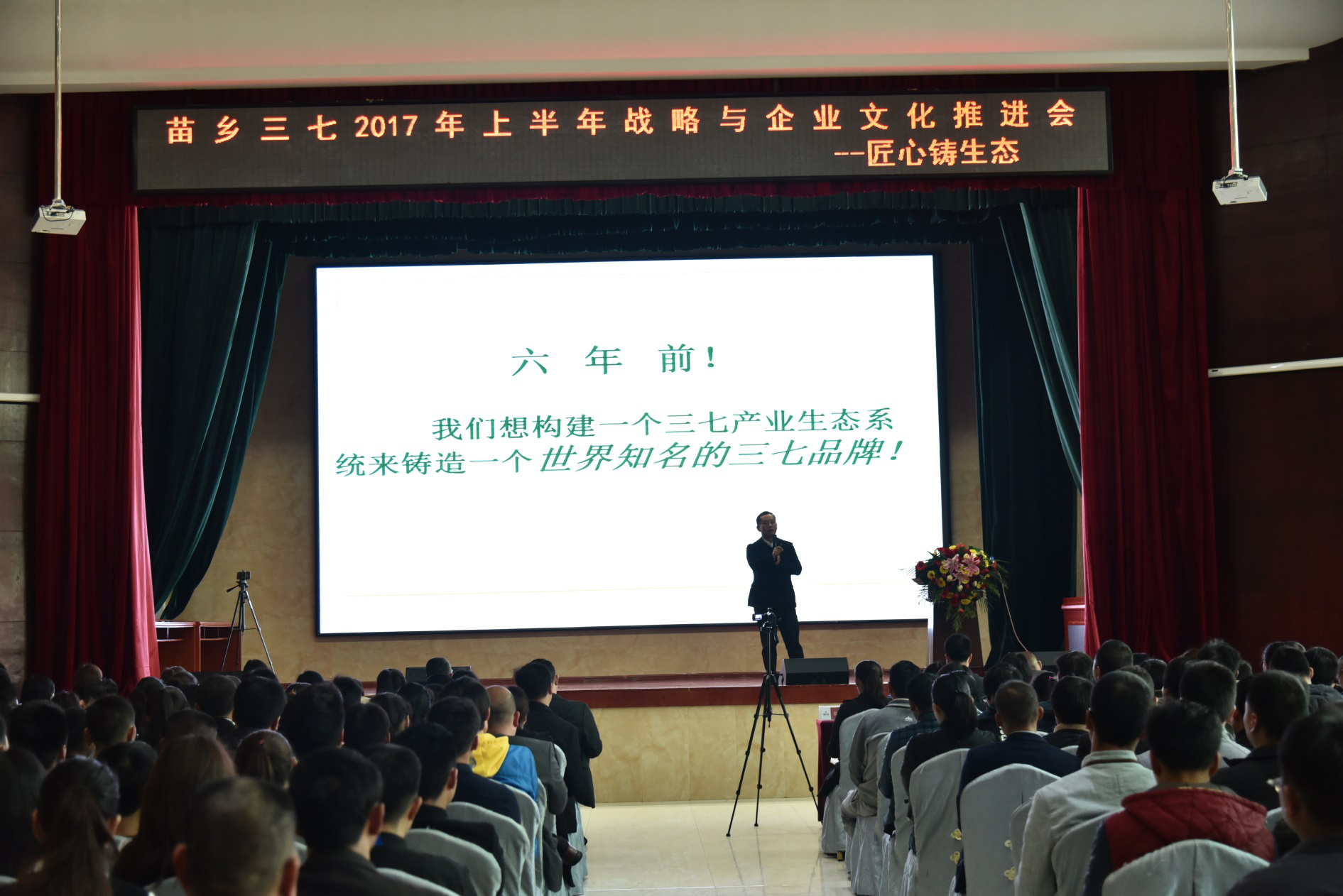 2017年3月7日,苗鄉(xiāng)三七2017年上半年戰(zhàn)略與文化推進會在文山普陽大酒店召開,股份公司、科技公司、實業(yè)公司、昆明分公司共338名代表參加了會議,本次會議的主題為“匠心鑄生態(tài)”。